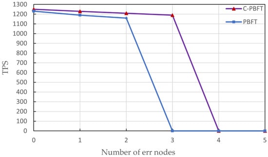 In order to verify that the C-PBFT consensus algorithm has more significant advantages in fault tolerance, the transaction throughput and error node relationship after the test model runs stably. Eight consensus nodes are deployed on the blockchain simulation platform, and the error nodes are simulated as 0, 1, 2, 3, 4, and 5 in turn. The average of 10 experiments is taken to compare whether the PBFT consensus algorithm can agree on consensus before and after optimization and to find the maximum value of error-tolerant nodes. The experiment is shown in Figure 6.