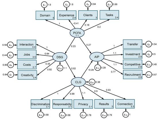 The SEM model was processed through the maximum likelihood estimator (MLE) method in Stata (Figure 2). To test for the SEM models’ accuracy, we processed several robustness tests. In the goodness-of-fit test (Table A1), the comparative fit index (CFI) and Tucker–Lewis index (TLI) present a value close to 1, meaning that the model has a proper degree of fit. The coefficient of determination (CD) indicates that in over 54.9% of cases, the proposed observed variables influence the latent variables. We also processed the following tests: Cronbach’s alpha test (Table A2), where the total scale of the coefficient alpha is optimal (>0.7), and the Wald test (Table A3), that concluded with a p-value of 0.000 for one latent variable (CLG), 0.05 for the second (AIP), and 0.4 for the third latent variable (DSG).
