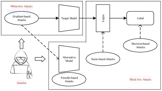 Existing attack methods can be broadly classified into white-box attacks and black-box attacks. Figure 2 briefly depicts the principles and differences between the various kinds of attacks. White-box attacks are further subdivided into gradient-based attacks [,,] and optimization-based attacks [,]. Optimization-based attacks can produce visually better adversarial examples than gradient-based attacks, but they can also consume greater time costs. Black-box attacks can also be further classified into transfer-based attacks [,,,,,,,], score-based attacks [,], and decision-based attacks []. In contrast to transfer-based attacks, both score-based and decision-based attacks involve massive accesses and queries to the neural network, which is harder to implement in practical scenarios. Therefore, we focus our research around transfer-based attacks. Transfer-based attacks usually occur in two steps. First, a white-box attack is employed under an alternative model to generate adversarial examples. Afterwards, these examples are transferred to the target model for the attack. This white-box attack is typically referred to as gradient-based attacks, as they are relatively efficient and easy to implement. Here, we mainly review the work related to transfer-based attacks.