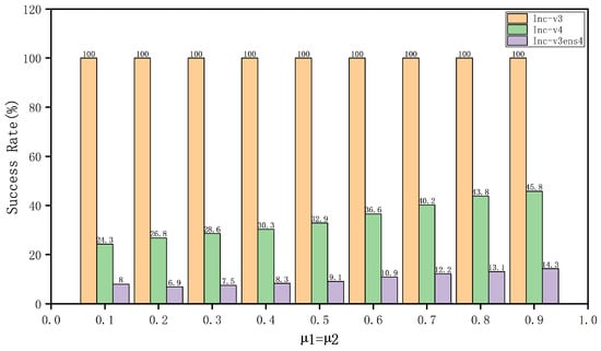 From this, we can draw a preliminary conclusion that the size of the decay factor is irrelevant to the effectiveness of the white-box attack. Meanwhile, as the gradual grow of the value of the decay factor, the effect of the black-box attack improve accordingly. Also, since we first set the values of the two decay factors in the interval , then we should continue to explore in the interval with values . Here, values of the two decay factors cannot be set to 0, 1 or other range of values due to the limitation of our algorithm.