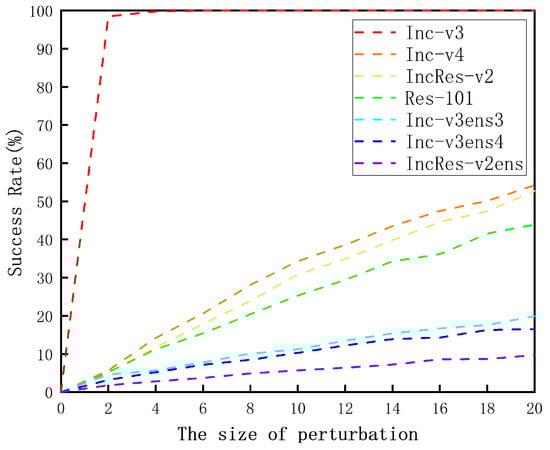 Size of perturbation . Second, we study the effect of the on the attack performance. Figure 5 demonstrates the effect of NAI-FGM attack at different sizes of perturbation. In this experiment, the size of perturbation varies from 0 to 20 in step of 2. From the Figure 5, we can clearly see that the success rate of the white-box model of NAI-FGM can reach 100% very quickly. Additionally, The effectiveness of the attack under the six black-box models tested improves with increasing of .