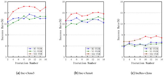In addition, Figure 6 presents that the attack success rate curve of NAI-FGM under different iteration number settings undergoes a slight oscillation. However, with T increases, the attack effect is getting better in the overall. Therefore, we can derive that the greater the number of iterations, the better the attack effect, but the corresponding time cost will also increase. Ultimately, we propose to set the number of iterations of NAI-FGM to .