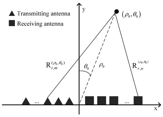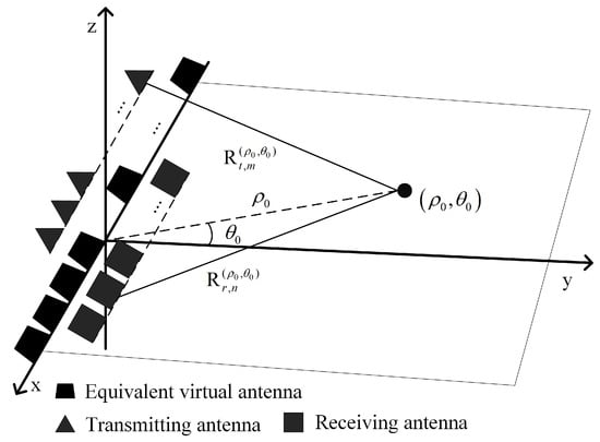 where is the azimuth envelope, and L is the aperture length. is the compressed range envelope, c is the speed of light, and is the carrier frequency. Suppose the target is located at , is the distance from the target to the center of the radar array, is the angle between the target and the center of the radar array, is the distance from the m-th transmitting unit to the target, and is the distance from the n-th receiving unit to the target.
