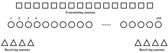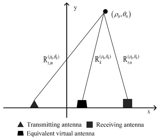 Ground-based MIMO-SAR with multiple transmitting antennas and multiple receiving antennas can form multiple pairs of combined receiving and transmitting channels to obtain a longer equivalent aperture with fewer antennas. The combination of M transmitting units and N receiving units can provide MN equivalent virtual antenna units. In the far field, it can be equated that the signal is transmitted and received by the same virtual antenna unit. However, in the near field, the phase center approximation error needs to be compensated [26,27], as discussed below.