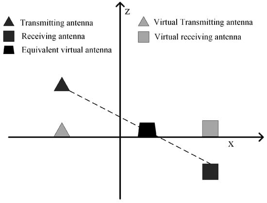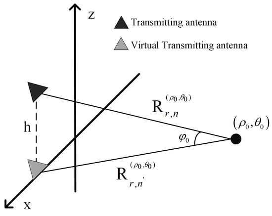 In the actual MIMO-SAR system, there is usually a height difference between the transmitting and receiving arrays. The principle of non-collinear array MIMO radar is shown in Figure 5. The position of the equivalent virtual array is taken as the x-axis, denoting the position of the transmitting unit as and the position of the receiving unit as . The radar center axis is taken as the z-axis, denoting the position of the transmitting unit as and the position of the receiving unit as .