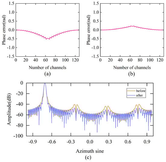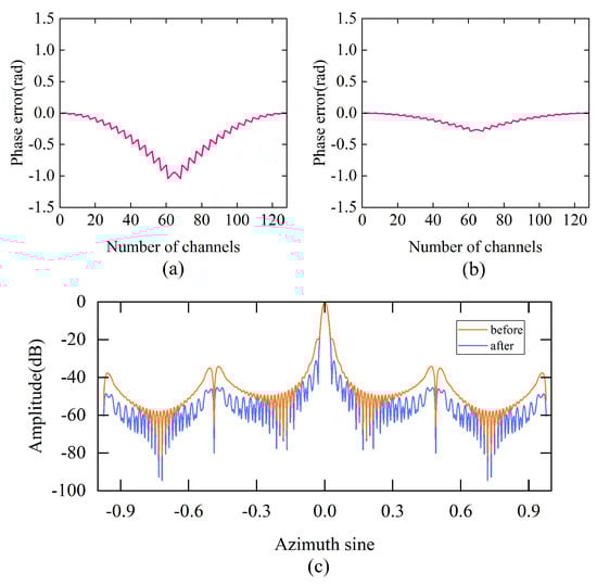 The distance error caused by the height difference in Equation (9) does not change with the switching of the transceiver channel and has no affect on the imaging. Therefore, only the first term in Equation (9) needs to be compensated. The error compensation method is as follows. First, the raw echo data are processed to get the range compression result. Then, for each range bin, the data are compensated according to the positions of the receiving and transmitting array unit. The compensated phase error can be expressed as