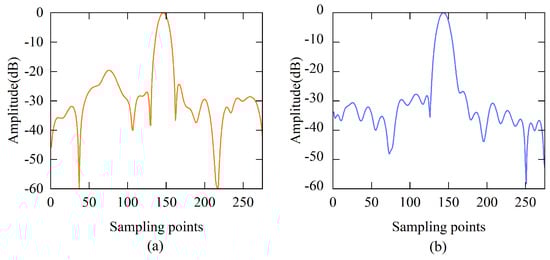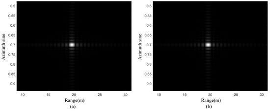The subimage coherent synthesis algorithm based on geometric transformation proposed in this paper is used to process the near-field single point target simulation data, The results are shown in Figure 14, and the focusing performance comparison is shown in Figure 15. The simulation parameters are shown in Table 1. Then, the single point target is set at , and the corresponding azimuth sine value is 0.707. The two-dimensional resolution and peak sidelobe ratio of the imaging results are shown in Table 3. The simulation results show that both images are focused well.