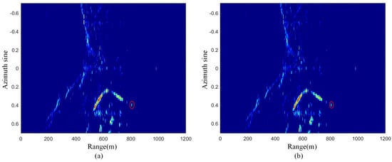 Since is very small, the angle rotation after approximation is only related to the distance, Thus, the angle rotation can be achieved by IFFT, linear phase multiplication and FFT. After angle rotation, the position of target P is converted to , and the azimuth variable of target P relative to the subaperture center is converted to the azimuth variable relative to the full aperture center. Then, the imaging results of the subaperture coordinate system are converted into the full aperture coordinate system.