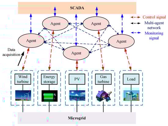 Microgrid implementation has considerably increased the amount of solar, wind, and other renewable energy sources, lowering power system costs, pollutant emissions, and environmental contamination. The flexibility of energy storage devices, microgrid system structure and power generation devices improve the utilization rate of electric energy. Appropriate control strategies can significantly improve the power quality and improve the economic indicators of the power grid. Each bus node of the microgrid topology has an associated agent that can communicate with its neighbors over a communication network. At the same time, between the physical and communication layers, there are intermediate units where the acquired data is processed and analyzed in order to perform distributed algorithms. This results in a multi-agent-based distributed architecture for an IEM as shown in Figure 1.