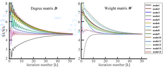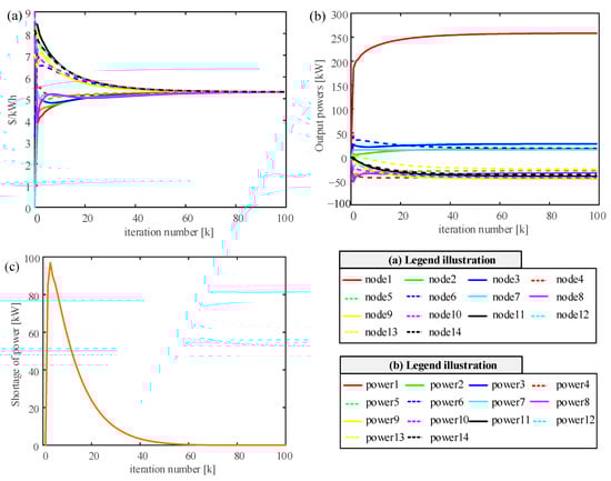 Figure 3 depicts the result of the simulation. From Figure 3a. It can be seen that the 14 nodes achieve the same incremental cost rate of 5.31$/kW·h and satisfy the equal consumption incremental rate principle. Thus, the economically optimal operation is achieved. From Figure 3b,c, it can be seen that the nodes reach the power balance of supply and demand. The algorithm is verified as effective.