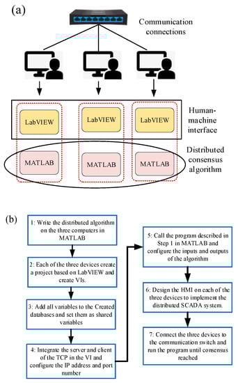 The distributed experiment based on the LabVIEW platform and MATLAB software aims to realize the consensus-based distributed optimal dispatch of IEM with a communication network. The overall schematic diagram of the experimental platform is shown in Figure 5a. The establishment of the communication network guarantees the information interaction of the agents and combines the high computational power of MATLAB and the user-friendly HMI of LabVIEW, leveraging their respective strengths to achieve distributed optimal dispatch.