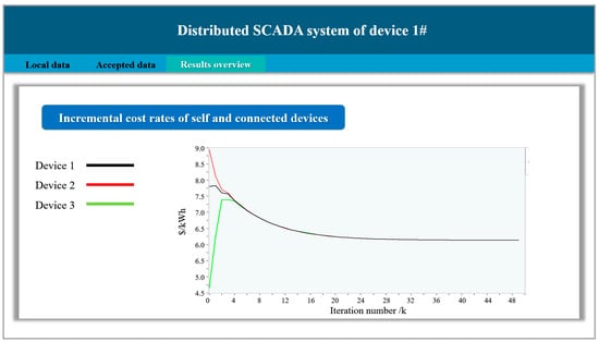 The incremental cost rates for devices 1, 2 and 3 without the consensus-based dispatch are $7.80/kW·h, $8.94/kW·h, and $4.65/kW·h, respectively. And from the experimental results, it is seen that the three units yield a convergence consensus result of 6.13$/kW·h with the integration of the distributed optimal dispatch algorithm. The incremental cost rate for devices 1 and 2 is reduced by 21.41%, and 31.43%, respectively. The total incremental cost rate reduction for all three devices, as shown in Figure 8d, is 14.03%. It can be concluded that the proposed distributed consensus-based algorithm effectively reduces the power generation cost of the whole IEM system.