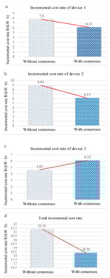 Incremental cost rate without and with consensus algorithm of (a) device 1, (b) device 2, (c) device 3, (d) Total incremental cost rate of the 3 devices.