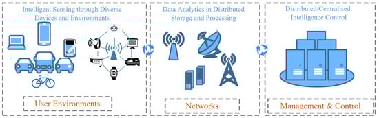 Fast and focused data processing through edge computing is the cornerstone of applications in 6G, for example, in vehicle-to-everything communications [46]. In-depth data analysis could be carried out by the centralized cloud at the expense of delays [47]. Figure 1 shows a simplified architecture of an AI-based 6G network, which is divided into three parts: user environment, networks, and management and control. In the management and control, functions such as parameter optimization, resource management, and task scheduling are carried out. In the network part, some of the tasks performed are data filtering, knowledge discovery, and feature extraction for data analytics, besides the usual network layers’ work. Finally, in the user’s environment, all the sensing, monitoring, and data collection occurs. The increase in data volumes being processed at the edge of the network represents a difficulty in properly identifying useful data for a primary analysis, prior to passing them to the centralized cloud. These requirements have paved the way to the intelligentization of the edge computing, referred to now as edge intelligence or EdgeAI [48], transforming it into a AI-based platform capable of offering intelligent services [49]. In order to achieve this, research hs departed from the centralized cloud-based approach, sparkling an interest in distributed, low-latency, and reliable AI at the edge [50,51].