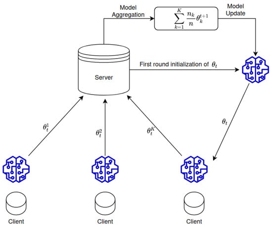 Figure 2 shows a simplified flowchart of the previously explained FL process. represents the global model parameters, corresponds to the data size of the client k, K is the total number of clients, and t is the communication round.