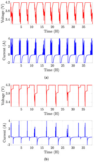 A set of long-term (more than 50 h) published data was utilized to test the standard and the proposed models. Four lithium-ion batteries were repeatedly charged to 4.2 V and then discharged to 3.2 V using a randomized series of discharging currents between 0.5 A and 4 A. This discharging profile is annotated as “random walk (RW) discharging”. The RW discharge profiles are made up of intervals of battery resting (zero current) and 5-minute battery discharges at a specific current. Figure 2 presents the voltage and current test profiles.