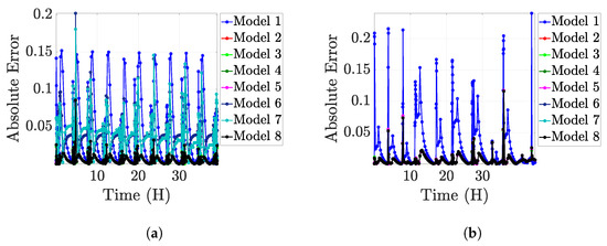 The absolute error for the proposed models (a) first RW data, and (b) last RW data.