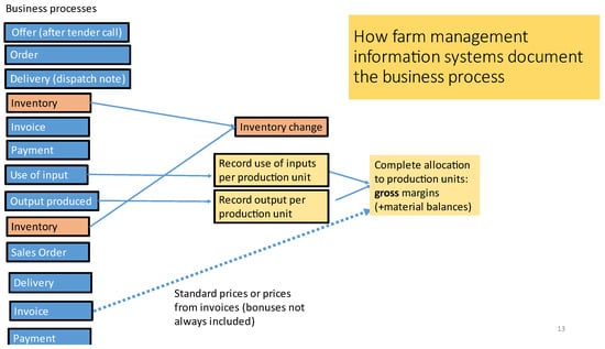 The integration of FMISs and FFAs starts with recording the payments and invoices, in which robotic accounting can be used to minimize manual data entry and coding []. This creates a register (daybook in accounting terms) of bought/sold with (presumably) delivered inputs and outputs. Where needed (e.g., animals), delivery dates and data can also be recorded, but these are exceptions as a farm does not need a full ERP with data on orders and deliveries or a real-time inventory data set. To integrate this with the recording of farm activities and their use of inputs or outputs and allocation to enterprises, procedures as in an FMISs create a register (daybook) with, respectively, input use and output created (harvest data). Although this remains a manual exercise (if not replaced by sensor data), it becomes easier and provides higher-quality data as a result of integration: it can be supported by suggesting inputs already recorded from the invoices and price data do not to be added. However, this is not a perfect improvement as invoices can arrive after delivery and use and are not necessarily already in the system. Prices are added to the use-data at the moment invoices are available on a FIFO (First in-First out) basis, also taking discounts into account (and until that moment, the software might use standard prices if needed for e.g., planning purposes). Allocation of inputs should include the option to allocate to general use (e.g., maintenance of ditches and farm roads) and an option to label for private consumption (Figure 4 shows our graphical model).