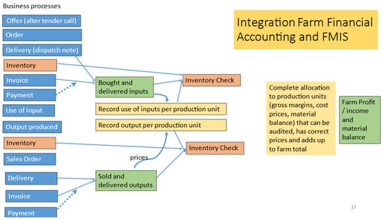 Integration of Farm Financial Accounting and Farm Management Information Systems without installing a full ERP (enterprise resource planning program) on a farm would be a combination of recording (bank) payments, invoices, the use of inputs with their allocation to enterprises, and the production of output. Such an approach combines the current approaches of the two software applications, uses their strengths, removes redundancy in manual data input, and creates synergies in data quality. The integration would reflect Luca Pacioli’s original day book in the farm office, leaving more complicated accounting and auditing tasks to professionals.