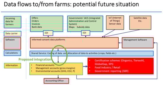 As explained by [] in Figure 6, such software in the farm office benefits from informed consent data platforms for handling digital messages with authorizations and identification procedures and a shared coding service that supports rules for robotic accounting and uniform coding. This shared coding service would guarantee that, e.g., crop codes are equivalent to those used in CAP subsidy schemes or statements with mass balances are acceptable to certification organizations. These functionalities could be created at a regional or national level as a collective action or public utility or as part of a commercial platform. Based on this common data management, the software for the individual farm office would generate financial accounts, management accounts, and environmental accounts that the farmer could share with their advisers, accountant, and certification bodies. Data could also feed into more complex FMISs or farm decision support tools that interact with machinery.