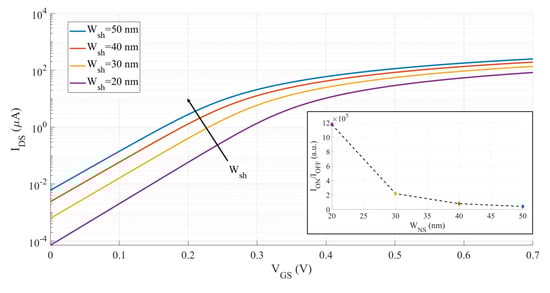 Parametric n-NS-GAAFET transcharacteristics IDS(VGS) in semi-logarithmic scale with different nanosheet width Wsh values; the inset shows the corresponding ION/IOFF ratios.