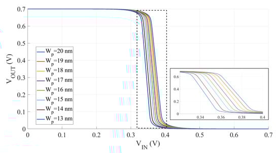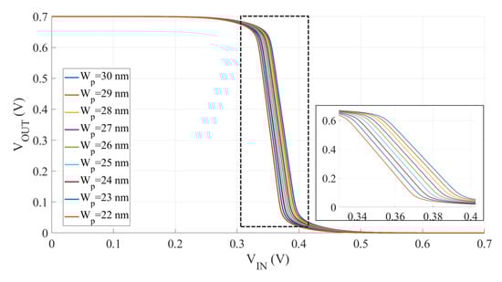 Parametric inverter transcharacteristics VOUT/VIN with different p-type nanosheet width and with = 20 nm; the inset shows an enlargement of the dashed box portion.
