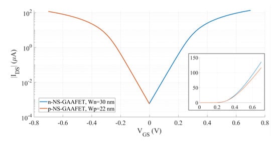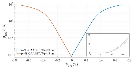 We repeat the same for the LP process and we find an optimum of 14 nm. The inverter transcharacteristics obtained by varying are reported in Figure 5; the inset shows an enlargement of the dashed box region. The ratio is 0.7. The relative n-type and p-type NS-GAAFET transcharacteristics with = 20 nm and = 14 nm are reported in Figure 6 in logarithmic scale. Again, good symmetry is present for the chosen transistor widths.