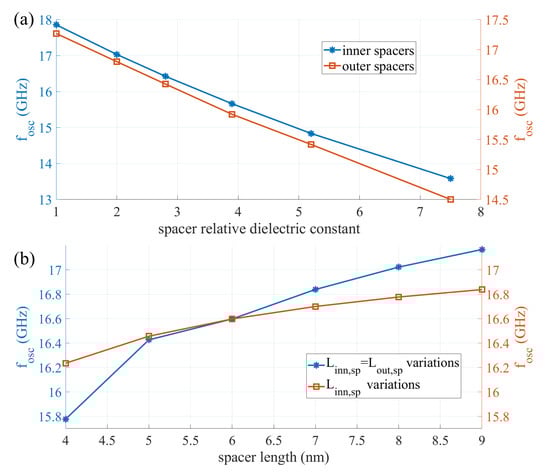 Figure 7a reports the RO oscillating frequency as a function of both and . We consider the (relative) dielectric constants in Table 2. An increase in the spacer dielectric constant leads to an increase in inner and outer spacer capacitance. Therefore, a frequency reduction occurs. There is no compromise with other NS-GAAFET parameters and the only upper limit to is dictated by the lowest possible dielectric constant, theoretically equal to 1 vacuum. Nevertheless, the structural and mechanical properties make it difficult to build suspended NS, and dielectric materials are used to guarantee structural stability and prevent the gate and S/D short circuits.