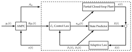 An overview of the AMPC- architecture is shown in Figure 1. The details of the AMPC- algorithm are found in [29]. The dashed box shows the adaptive control structure that interacted with AMPC via the desired closed-loop dynamics matrix , reference , and state .
