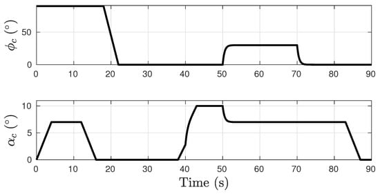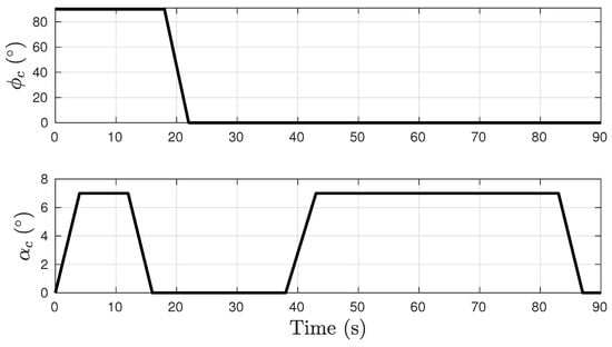 The specifics of the guidance law design and requirements are outside the scope of this study. However, the uncertainty of the reference commands tracked by the attitude controllers may be considered. Therefore, a change in guidance commands is considered in this section. There were no further changes to the controller design parameters (Figure 11).
