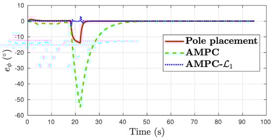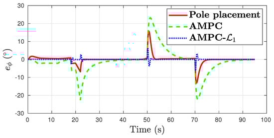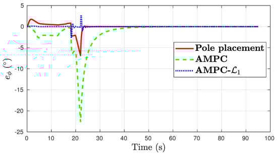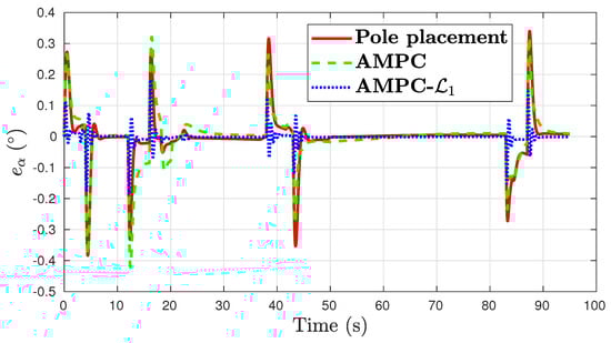 In the roll tracking task, a large transient error of over was present when baseline AMPC was used, as shown in Figure 8. Compared to the results from the nominal case in Figure 4, the pole placement and AMPC controllers produced double the maximal transient error in the presence of aerodynamic errors. This is in contrast to AMPC-, which retained the control performance of the nominal case.