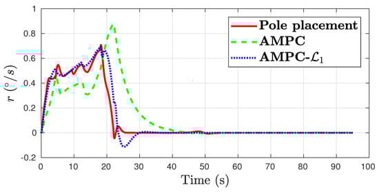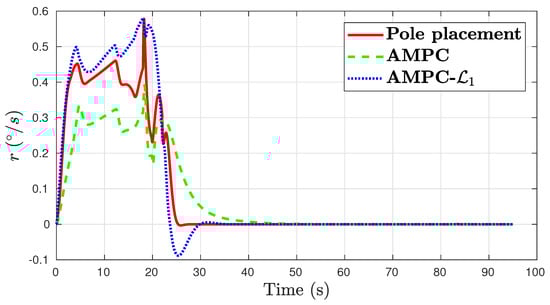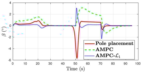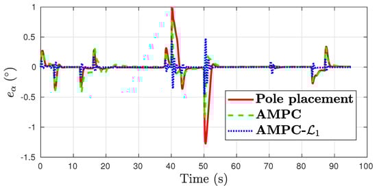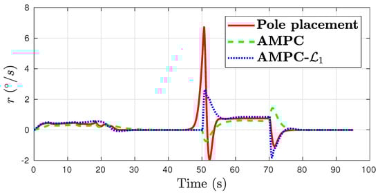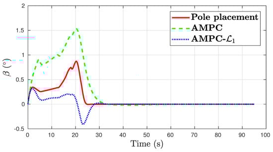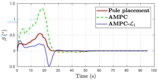 The control performance plots are shown in Figure 12, Figure 13, Figure 14 and Figure 15. The three control algorithms show a similar tracking performance. Baseline AMPC has large roll tracking error of over . The pole placement yaw damper results in the largest error in side slip and yaw rate. In all channels, the AMPC- achieves the best control performance.