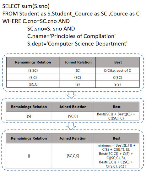 The join order problem can be formulated as the problem of finding the best rearrangement in a multi-table join, and it is one of the most important problems in query optimization research [1]. Figure 1 shows an example of a three-table join. Firstly, we calculate the best access cost for each relationship and enumerate the costs of all two relationship joins. Next, we enumerate the query costs of two relationships based on the results of past lookup calculations and compare them with the other two relationship joins. Finally, we add a third relationship to get the best cost of the plan. For the same query, there are different join orders and, in turn, various join execution plans, which can have different execution efficiencies [2]. In join order problems, attention needs to be paid to controlling the extent of the search space to reduce the search overhead because the search space exponentially increases with the number of table relations up to N! (e.g., 2.4 × 10 for N = 20). For connections over a certain number of relations, it is not even possible to give a reasonable [3] optimization order other than finding an efficient connection plan to control the execution overhead.