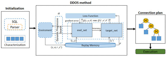 The main function of the query optimizer is to improve the execution efficiency of SQL statements. The optimization process is divided into two phases: logical query optimization and physical query optimization. The DDOS method proposed in this paper is mainly performed for the physical query execution plan generation phase of the optimizer, which outputs a predicted join plan for a given SQL query by guiding the selection of the join order. The framework of the method is shown in Figure 2. Although our methods look similar to DDPG, they are completely different approaches. The difference between our approach and DDPG is that DQN and DDQN have two sets of networks of their own, and there is no need to add a new neural network to configure the weights, while DDPG adds a Policy network and its Policy_target network to DQN to output a continuous value.