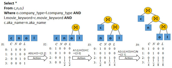 As shown in Figure 3, in state s3, row 3 corresponds to the representation of the join (l ⋈ o) ⋈ c, where the o table corresponds to a value of 1/4 in row 3, the height of the subtree in which it is located is 2, and the n-no join corresponds to a value of 0. We compare the data characterization methods of existing learning optimizers (e.g., DQ [13]). Each column of the database is used as a single feature of the database. A state is represented as a binary one-hot vector, where each number represents a column of the database. This action behavior effectively preserves information about the hierarchy between tables, facilitates capturing information about the structure of the join tree, reduces the cost of the optimizer in cost estimation, and allows the combination to be extended to multi-table joins with a large number of joins after training data containing local joins. In this study, multiple 1-hot [24] is also incorporated for implementing self-join query encoding. The representation of the left-right relationship, physical operation, and intermediate relationship size regarding the join action is . and denote the left-right relationship using n-dimensional vectors, is the physical join operation using one-hot encoding, and c is the base estimate of the join intermediate relationship.