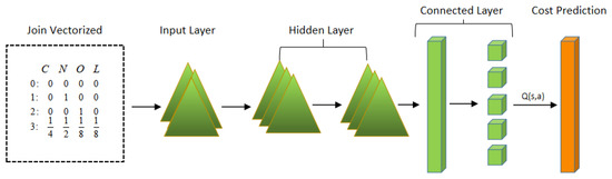 In the standard DQN network, the selection and evaluation of actions are based on the same parameters, which produces the overestimation of Q values and causes the DQN to overestimate action values. Haselt et al. proposed a dual DQN [22], where the estimation strategy is performed according to the online Q network and the selection of actions is performed using the target network for the estimation of Q values. This method can substantially alleviate the overfitting problem, but it also results in over- and underestimated action values, which affect the learned strategy and hence cause performance reduction. In the logic optimization stage, to reduce the negative impact of the overestimation problem of DQN and the underestimation problem of DDQN, this study applies the concept of a weighted dual estimator [13] in dual DQN to build a network that can accurately filter and improve the performance of the current query plan by calculating the “action–state” pair. The neural network is trained to regress the Q value by calculating the “action–state” pair, which reduces the error of the target estimate and achieves an accurate estimate of the Q value by balancing the weights of the DQN and DDQN while retaining the DQN and DDQN. The vectorized query plan tree, through the input layer of the neural network and the state information of the two hidden layers, is fed to the fully connected linear layer and then the mapping vector to the prediction of the performance cost using the rectified linear unit [14] activation function and layer normalization, as shown in Figure 4.