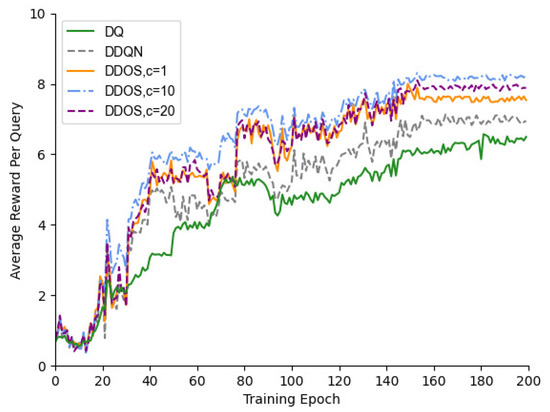 - First, the rewards obtained per query on average during the training phase are compared with methods, such as DQ, to verify the performance of DDOS during the training process and to explore the effect of hyperparameter c on the DDOS method.