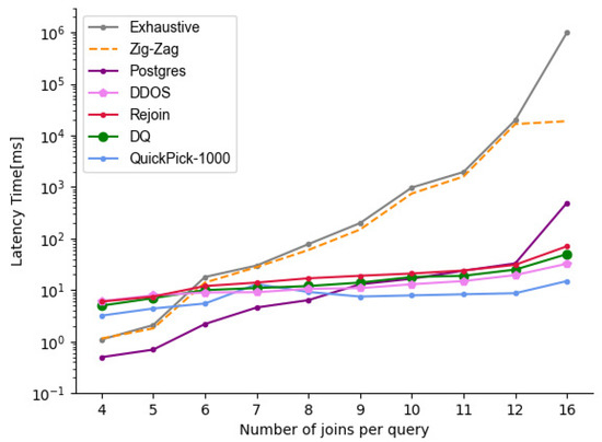 - We compared the efficiency of DDOS with different optimization methods for generating plans with a different number of connection relations, i.e., the time required to generate query plans (connection latency time), and verified to what extent the model reduced the optimization latency while guaranteeing performance.