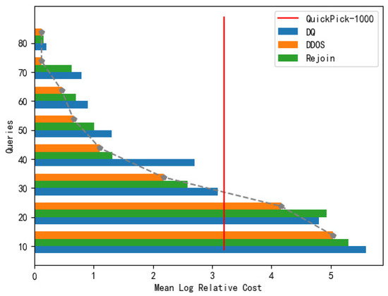 As shown in Figure 8, in some cases, DDQN and DQ could produce better-quality plans. However, the average relative cost maxima and minima of DQ vary greatly, with nearly 47% of the query execution costs being higher than DDOS, while the average and maxima of DDOS costs were lower than DQ. In addition, the number of outliers was significantly less for DDOS than for DDQN and DQ, which means that DDOS produced a more accurate action estimation and a more extensive action mining strategy produced a better query plan and a more stable query plan was obtained.