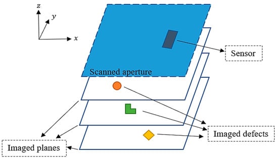 Figure 1 illustrates the proposed microwave holographic imaging setup that consists of a multifrequency near-field sensor that collects back-scattered data over a rectangular aperture. Such a scattered response is acquired by subtracting the response without the presence of the objects from the response with the objects. The image reconstruction process then provides images over the planes, where . The distance between the planes is denoted by . The imaging system is assumed to be linear (using Born approximation [19]) and space invariant (LSI).