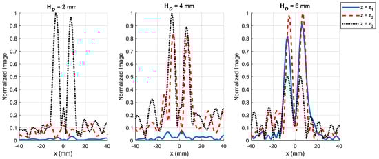 Figure 4 shows the reconstructed 1D images of the defects at the three imaged lines corresponding to the depth positions of the collected PSF responses. It is observed that as the depth of the defect () increases, at some imaged depths the normalized value of the image deviates from 1. This can be explained according to the further violation of the Born approximation for larger defects.