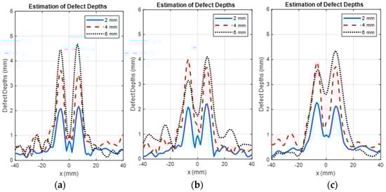Thickness estimation of defects with of 2 mm, 4 mm, and 6 mm with (a) = 2 mm, (b) = 1 mm, and (c) = 3 mm.