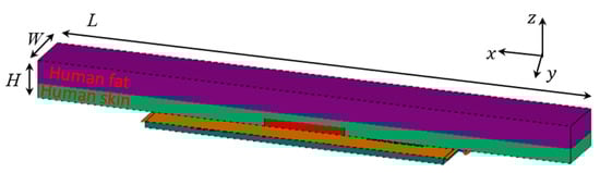 Here, we conduct a simulation study for sizing skin tumors. The human tissue is modeled with human skin and human fat. We use the corresponding dispersive (frequency-dependent) tissue models from the FEKO media library. Furthermore, the relative permittivity and conductivity of the tumor are assumed to be = 50 and 3 S/m, respectively. The relative permittivity of the skin tumor has been reported to be between 35 to 50 in the frequency range of 1 GHz to 10 GHz [22,23]. Here, it is assumed that the sensor scans the tissue in close proximity. The gap between the sensor and skin layer is considered to be 0.1 mm, representing the existence of a thin protective cover. Figure 7 illustrates the simulation setup for skin tumor evaluation when the tumor is on the surface of the skin. Here, the length and width of the skin layer are L = 100 mm and W = 10 mm, respectively. The human fat layer has a thickness of 3 mm and the human skin layer has a thickness of 2 mm. Like the dielectric material simulation setup, 1D scanning of the array of the sensor is implemented along the x direction from −40 to 40 with 81 steps to obtain the responses. In addition, similar to the previous example, noise with an SNR of 20 dB is added to the simulated responses in MATLAB for a practical study. In this example, we consider imaged lines at depths (layers) of 1.5 mm, 3 mm, and 4.5 mm, and PSF data is obtained a priori as in the previous example. We also perform a simulation of the tissues without any tumor to obtain the background responses. These background responses are then subtracted from the responses simulated with the presence of the tumors to obtain the scattered responses.