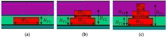 Figure 3 illustrates the reference setup in which there is a dielectric slab with a thickness of 1 mm above the sensor with a length of L = 200 mm, a width of W = 20 mm, and a height of H = 6 mm. The slab has a relative permittivity of = 4 and a tangent loss of 0.0001. Please note that, here, as a proof of concept, we present the results for one-dimensional (1D) imaging. We scan the sensor over the x axis (z = 0). We aim at evaluating the thickness variation of the slab with a 2 mm resolution while it has hidden defects (on the other side of the slab compared to the sensor position). For this purpose, the thickness of the 6 mm-thick slab can be estimated at three levels: , , and .