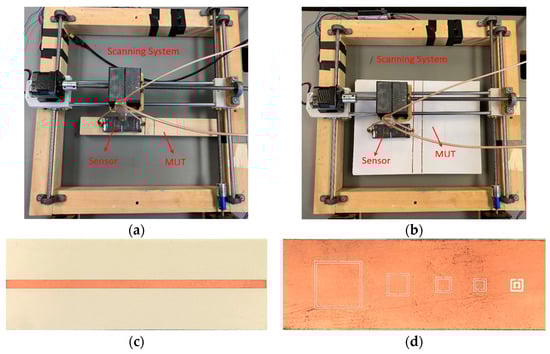 In this section, we present the proof-of-concept experimental results to detect defects and objects using the proposed technique. Figure 10a,b show the microwave imaging system that consists of a scanning system, one Arduino Uno, NEMA 17 stepper motors, MUT, and the sensor. The two types of MUTs used are wood and a pile of paper with 2 mm copper strips hidden inside. For both scenarios, there is an approximate gap of 2 mm between the MUT surface and the sensor. Furthermore, the MUTs are stationary while the sensor is scanning along the x-axis. Then, to reduce the interference, the sensor is backed by a box covered by a microwave-absorbing sheet. Then Figure 10c,d show the front and back of the multifrequency near-field sensor. As noted, an Anritsu MS46122B vector network analyzer (VNA) and a PC are used for data acquisition.