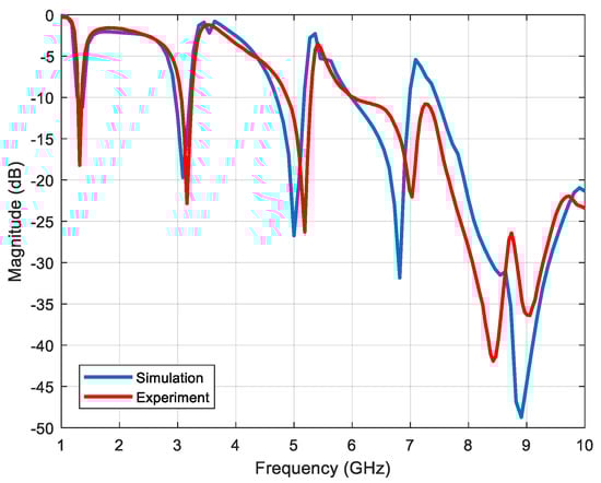 Figure 11 shows the comparison between the simulated and measured for the sensor array when the object is not present. As noted, for experiments, responses of resonating frequencies with the presence of the object are utilized. However, there are six resonant frequencies instead of five within the band of 1 GHz to 10 GHz, due to the coupling of the resonators which are in close proximity. They are at 1.216 GHz, 2.855 GHz, 4.549 GHz, 6.036 GHz, 7.783 GHz, and 9.054 GHz. The slightly different resonant behavior compared to the simulated response of the sensor is due to the use of the shielding box for the sensor array. With that being said, the following results are presented by using five and six resonant frequencies for comparison (when using five frequencies, we discard the data obtained at 7.783 GHz). In addition, similar to the simulation results, for faster data acquisition, we are scanning along one axis only.
