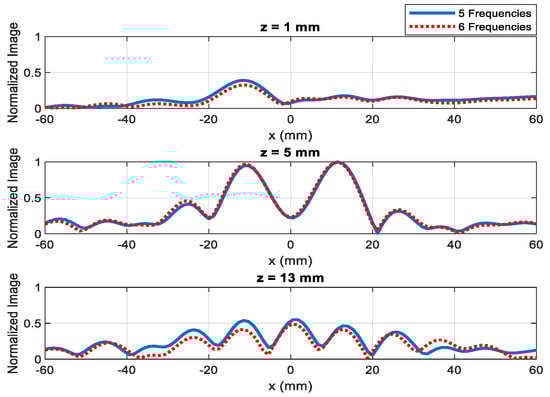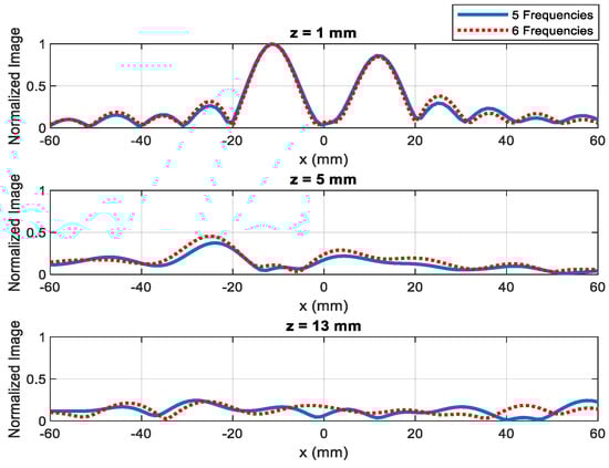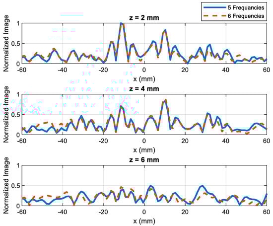 Then for the imaged scenario, two defects with depths of 4 mm are at x = ±10 mm. From the collected responses and applying the proposed method, the reconstructed images are as follows. Figure 12 shows the reconstructed images with five frequencies (discarding the data at 7.783 GHz) and six frequencies. Overall, the defect is distinguishable at z = 2 mm and 4 mm. Moreover, it can be observed that there are no major changes or improvements when using six frequencies.