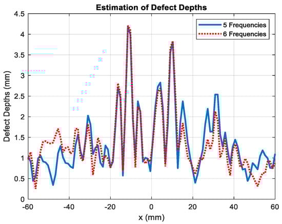 Then, in Figure 13, the estimated thicknesses of the defects are presented for both five and six frequencies when using (12) to combine the 1D images in Figure 12., It is observed that the estimated thicknesses do not differ significantly. Although the estimated depth of the defect value is satisfactorily close to the true value of 4 mm.