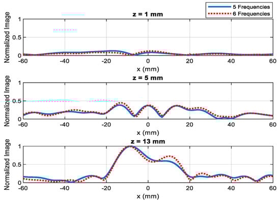 Figure 14, Figure 15 and Figure 16 show the reconstructed 1D images for copper strips placed at depths of 1 mm, 5 mm, and 13 mm and when using data at five and six frequencies. From Figure 14, it can be observed that the reconstructed image shows a clear peak at a depth of 1 mm for both five and six frequencies and there is no significant difference between the results utilizing data at five and six frequencies. Then, for Figure 15, the peaks are clear at a depth of 5 mm. Lastly, for Figure 16, one peak is more obvious compared to the other at a depth of 13 mm. In general, the results for objects at depths of 1 mm and 5 mm are better compared to those at depth of 13 mm. In addition, using six frequencies shows some improvement in the reconstructed image for the objects at depth of 13 mm. To improve this study, a better mechanical system can be built and implemented for imaging to reduce the undesired ripples in the stand-off distance of the sensor. In addition, changing the VNA settings such as increasing the averaging and narrowing the intermediate frequency (IF) bandwidth can improve the results at a cost of increasing the measurement time.
