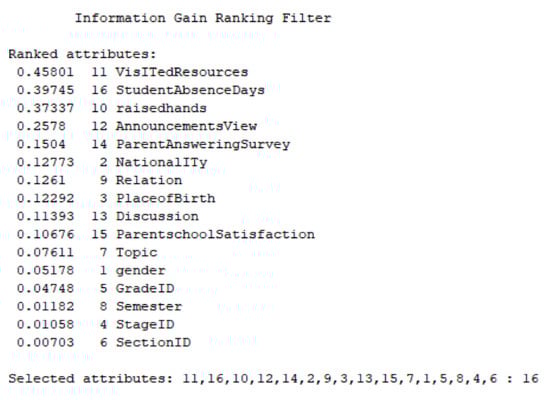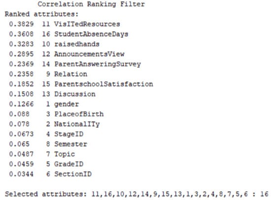 Figure 5 shows the rank between the attributes and the class. As we saw in the information gain filter, the most ranked feature is the visited resources feature, which is followed by student absence days and raised hand. From Figure 4 and Figure 5, the filters selected 16 attributes. As a result, the behavior feature impacts student performance more than the other features due to its significant impact.